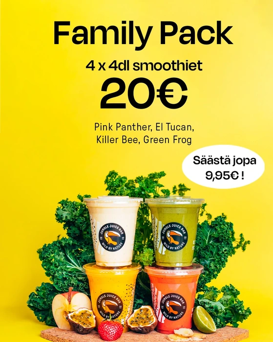 Jungle Juice Barissa Family pack -tarjous! 4 kpl 4 dl smoothieita nyt vain 20€! Family pack sisältää Pink Panther, El Tucan, Killer Bee ja Green Frog smoothien. Säästä jopa 9,95€.