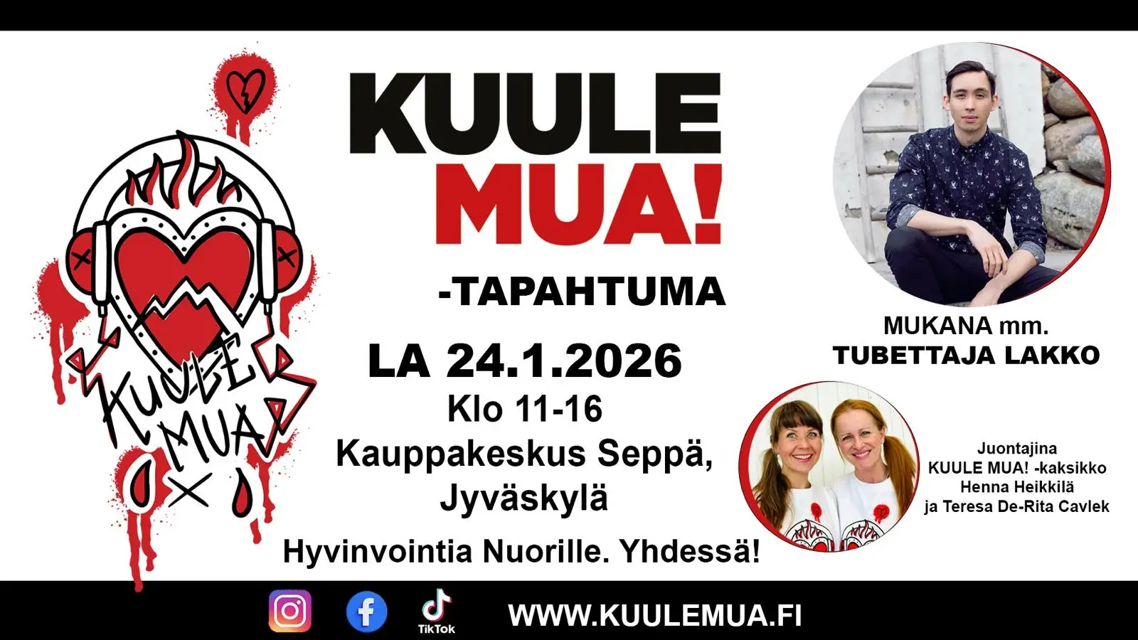KUULE MUA! saapuu Seppään la 24.1. ja tuo paikalle nuorille ja nuorten läheisille palveluita tarjoavia tahoja, kuten Jyväskylän kaupungin, Tyttöjentalon, Seurakunnan ja nuorisotoimet. Nuorten suosima tubettaja LAKKO saapuu kuulemaan nuoria sekä tapaamaan heitä meet & greetin merkeissä.