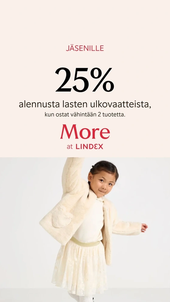Lindexillä nyt More at Lindex -jäsenille lasten ulkovaatteet -25%, kun ostat vähintään kaksi tuotetta. Tarjous voimassa 19.10. asti.