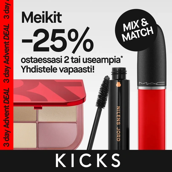 *Voimassa 12.–14.12. myymälässä ja osoitteessa kicks.fi. Ei koske Byredo, Charlotte Tilbury, Dolce & Gabbana, e.l.f., Hourglass, IT Cosmetics, KIKO Milano, Lancôme, Laura Mercier, MILK Makeup, NARS, Sensai, Too Faced, Urban Decay, joululaatikoita tai Nice Price -tuotteita.