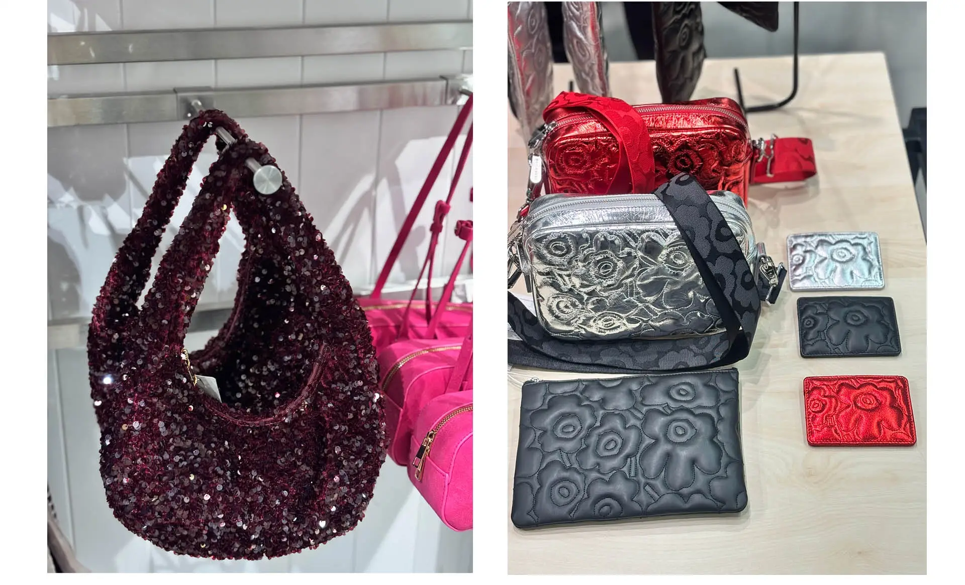 Kuvan Glitterlaukku on Lindexistä ja metallinhohtoiset laukut ja korttikotelot Marimekosta.
