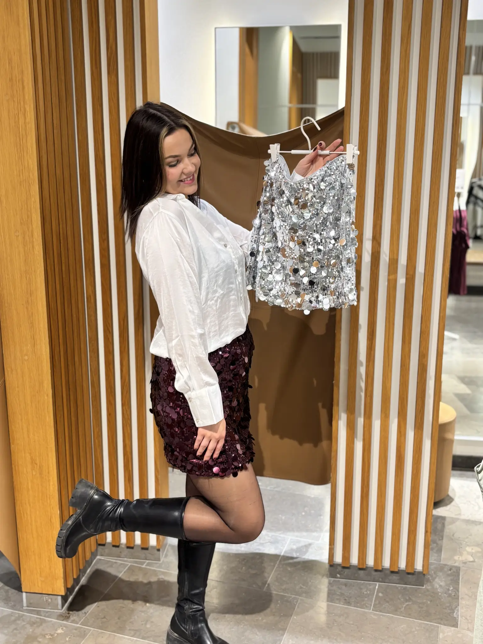 Paljettien rinnalla metallinhohtoa ja burgundia